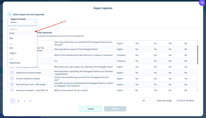 - You can scroll through the report and select/deselect the questions you would like to export.