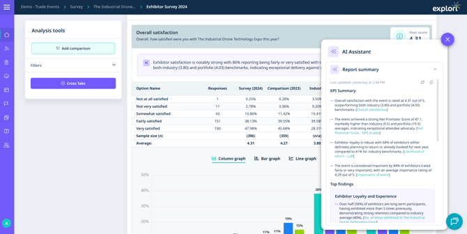 Explori’s AI-powered summaries turns raw data into clear, actionable insight in just a few clicks. As feedback begins to come in, the tool analyses your results in real time, compares them with your historical performance and industry benchmarks, and delivers an instant narrative of how your events are performing.
