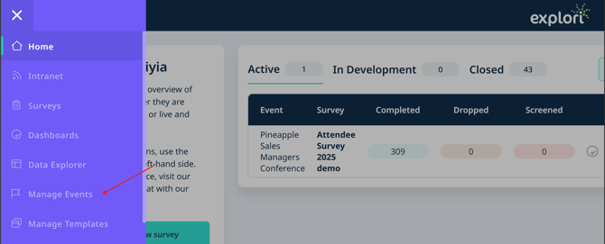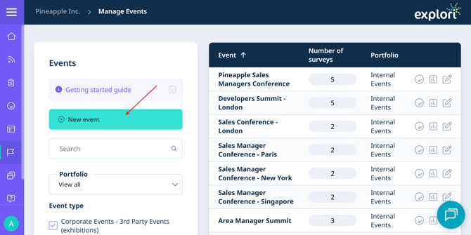 • To get started with creating your event, click on "Manage Events” button on the ribbon on the left and then "New event".