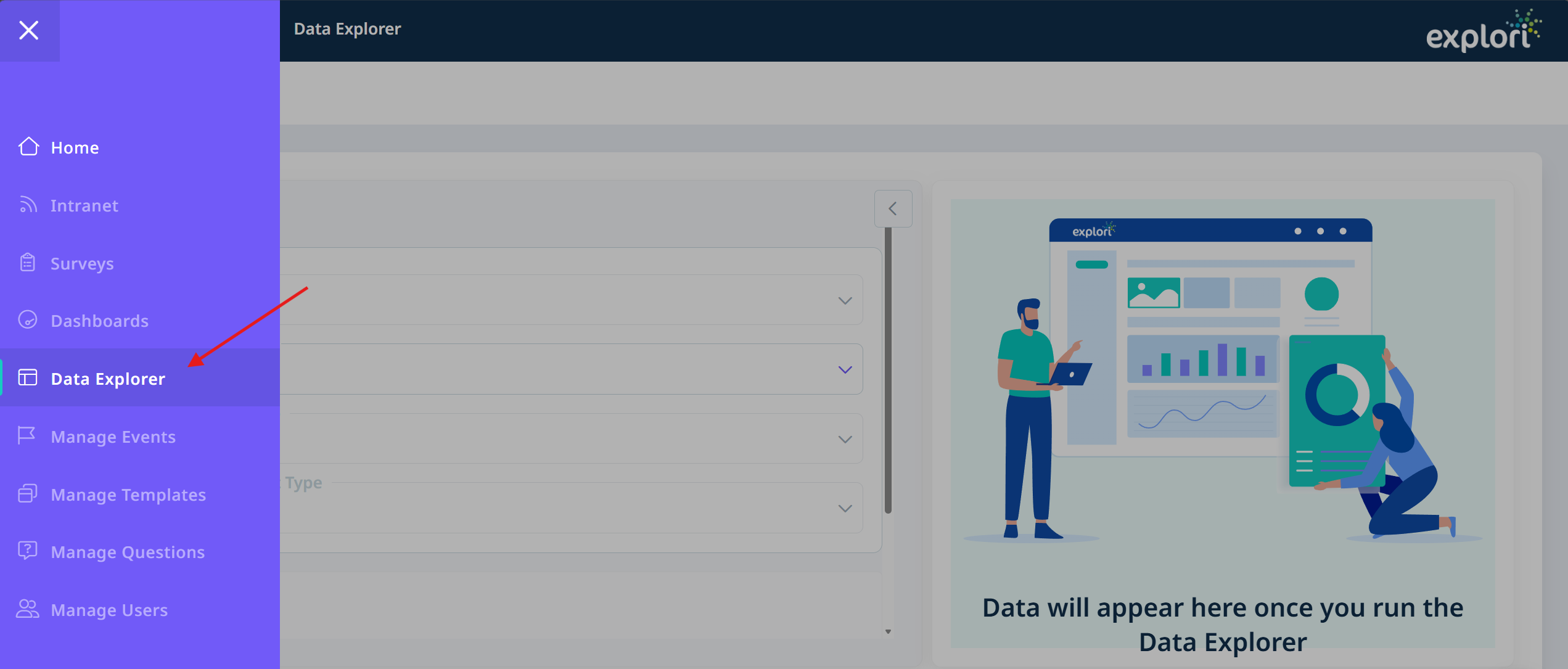 To access the Data Explorer, select Data Explorer on the side menu.