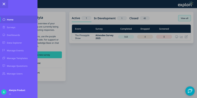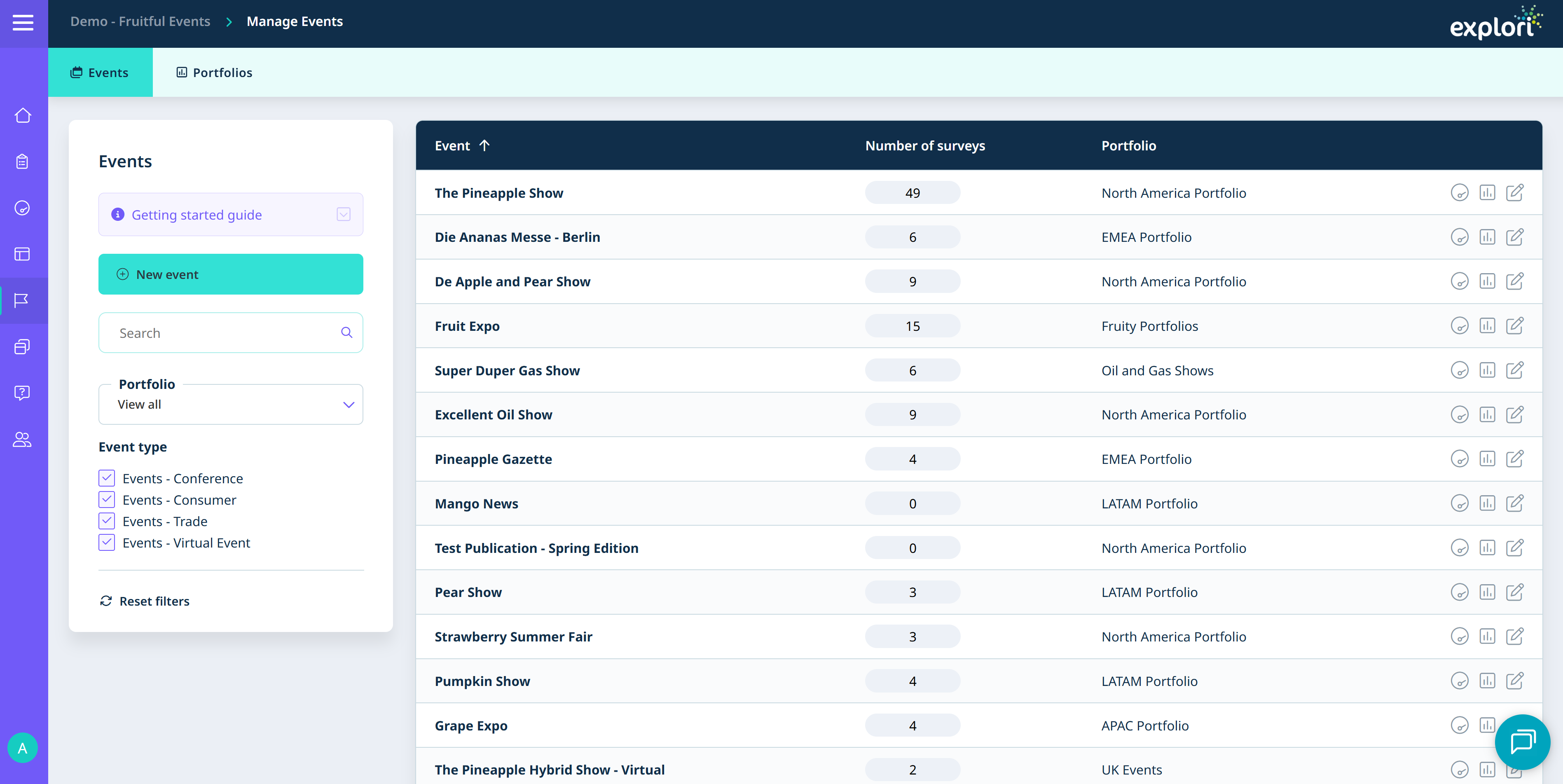 Here you can view all of the different events and portfolios you have access to on the platform. On the left, you can filter by portfolio and event time. You can also make any amendments to your events/portfolios and navigate to individual survey reports/dashboards.