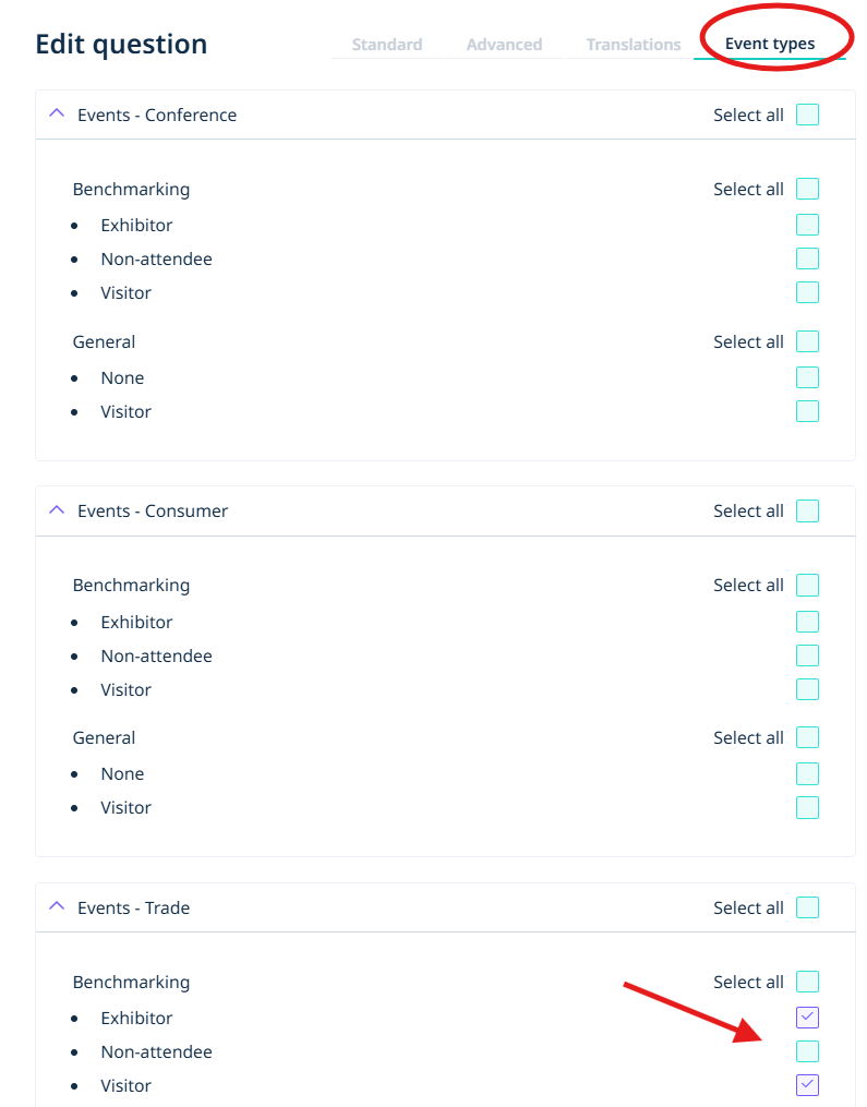 - Once you have set up your question, go to ‘Event types’ and select the events you would like the company question to appear for.