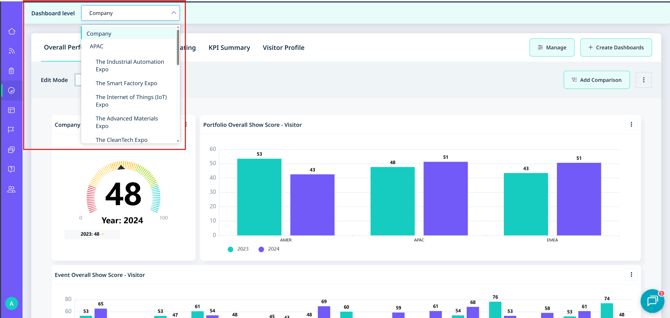 Select the level of dashboard you would like to create on the top right. You can create a Company, Portfolio or Event Level dashboard. For event or portfolio, select the event/portfolio you would like to create the dashboard for. Once the dashboard has been created, you can also make it a template and apply it to all dashboards of that level.