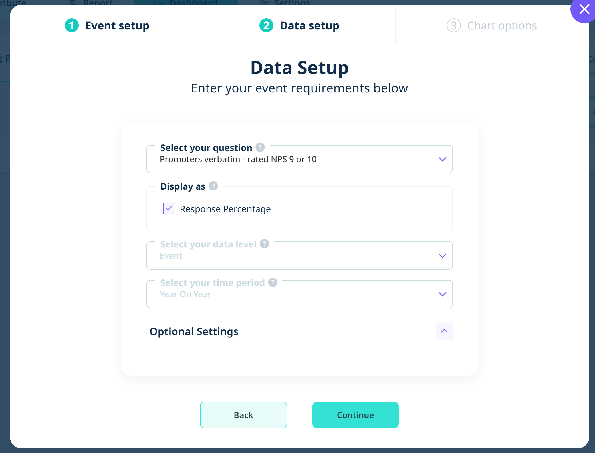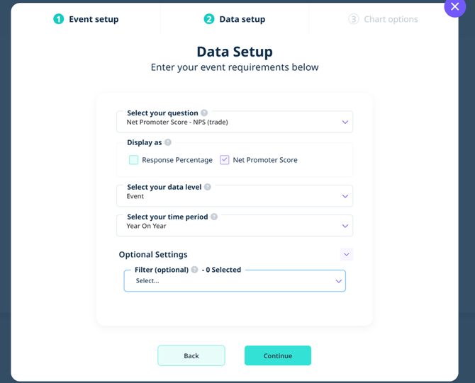 First, select the question you’d like to create the widget from. For this NPS example, you can choose to display the data as a percentage or NPS Score.
