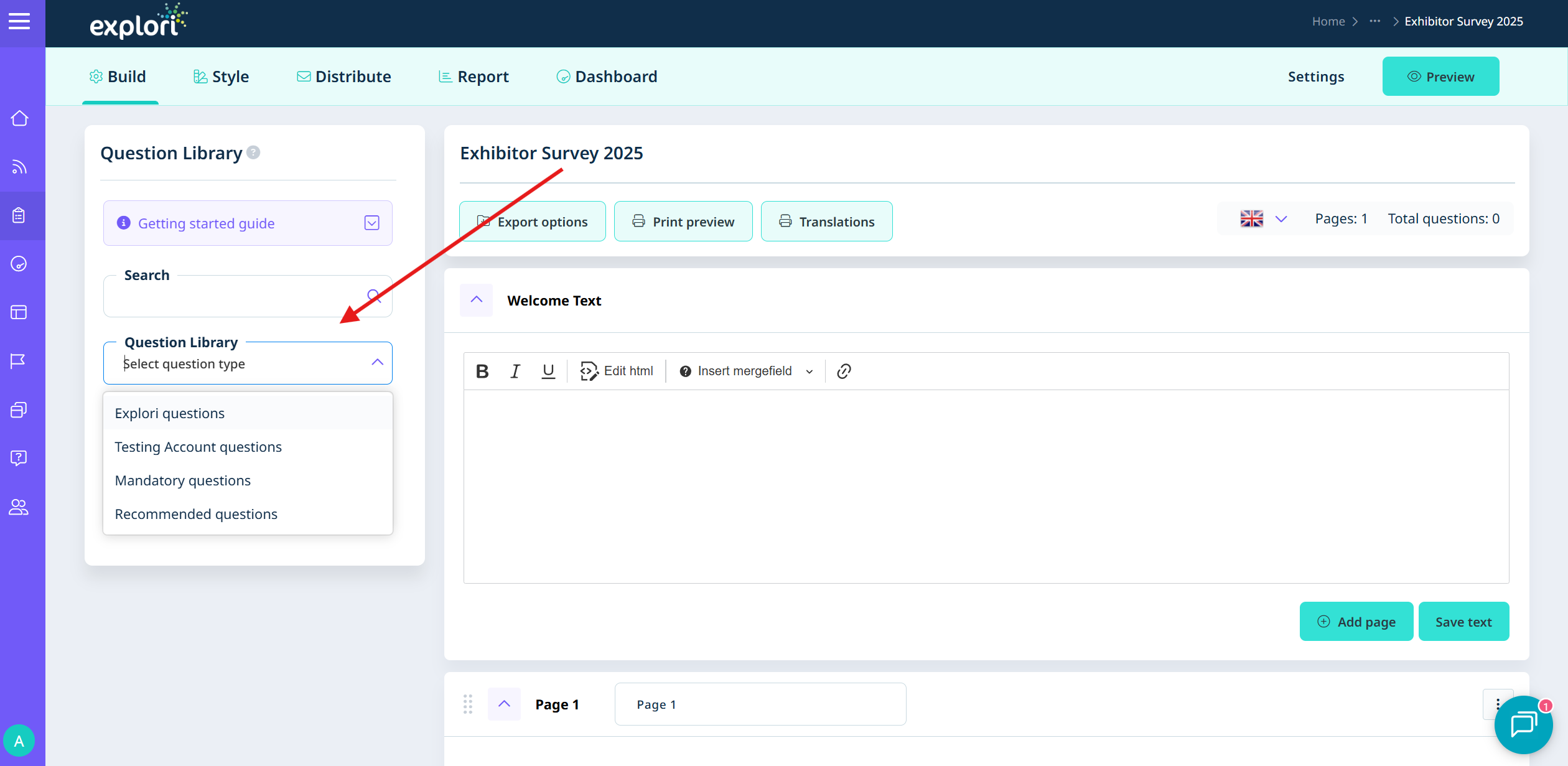 To add a question from the Question Library, select one of the options from the drop down. You can search for a question in the search box or select a question from the list. Then drag and drop the question onto the relevant page in the survey.