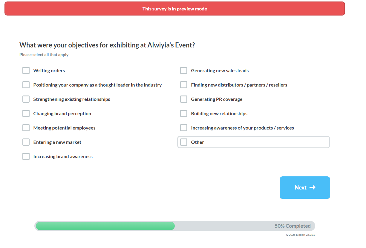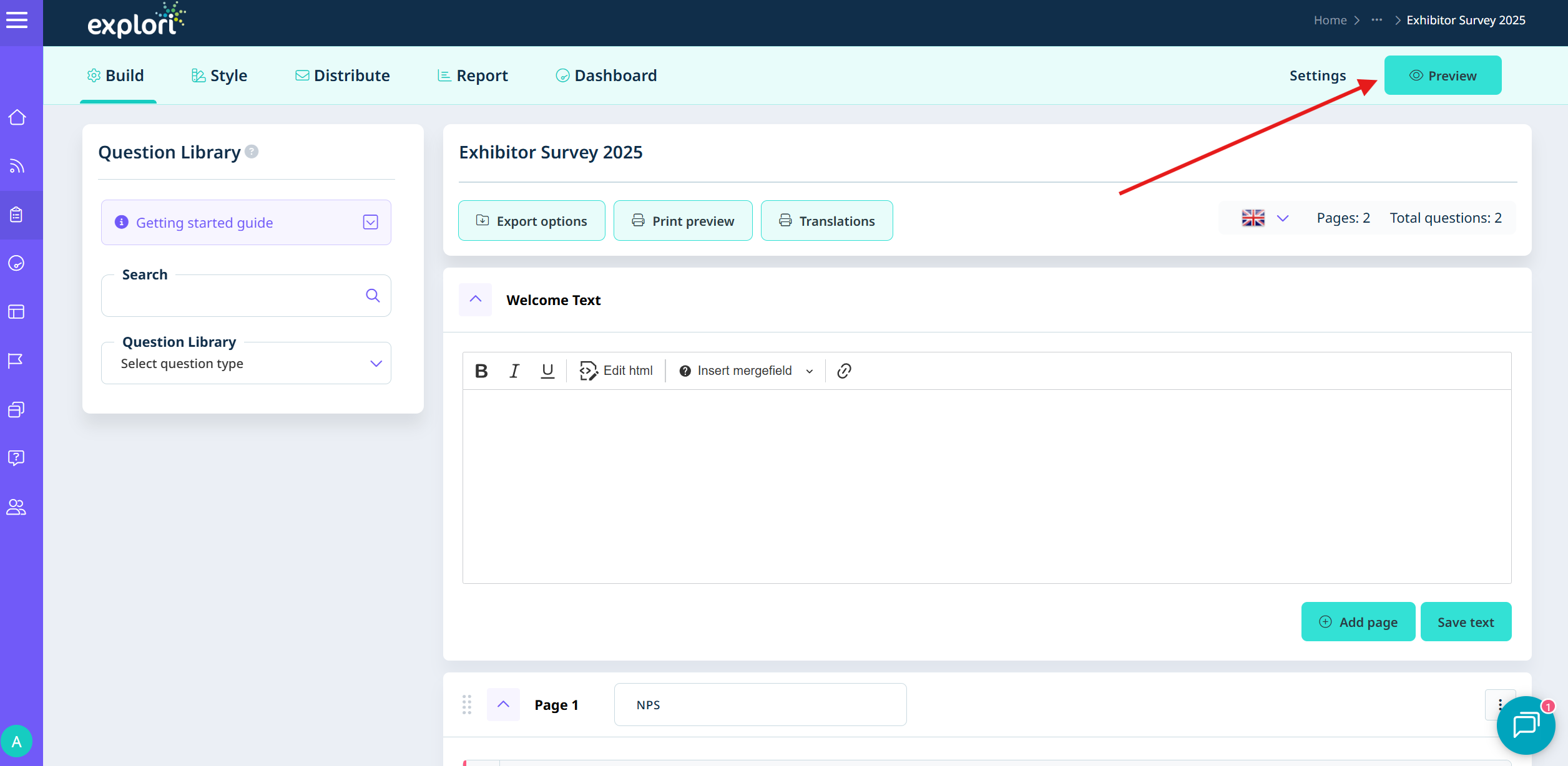 Once you have added everything to the survey, it is always recommended to test the survey by clicking on the Preview button on the top right. You can also send the preview link to your colleagues so they can test the survey.