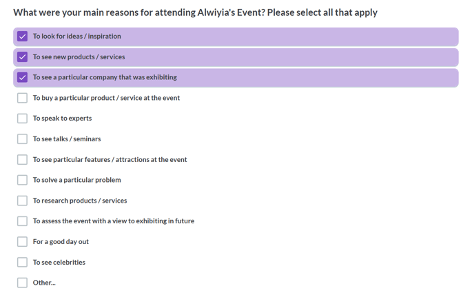 Inherited Options (often known as option piping) are used to offer a more personalised experience for respondents by only showing them the options they previously selected in a question rather than showing them a repeated list of options again.