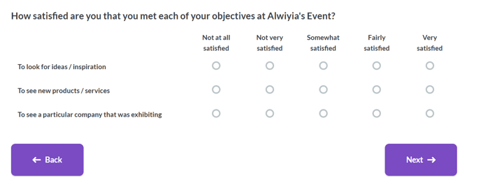 Rather than copying the options from the objectives question on Page 3 and pasting them into the rows, by inheriting, only the options selected in the previous question will be shown.