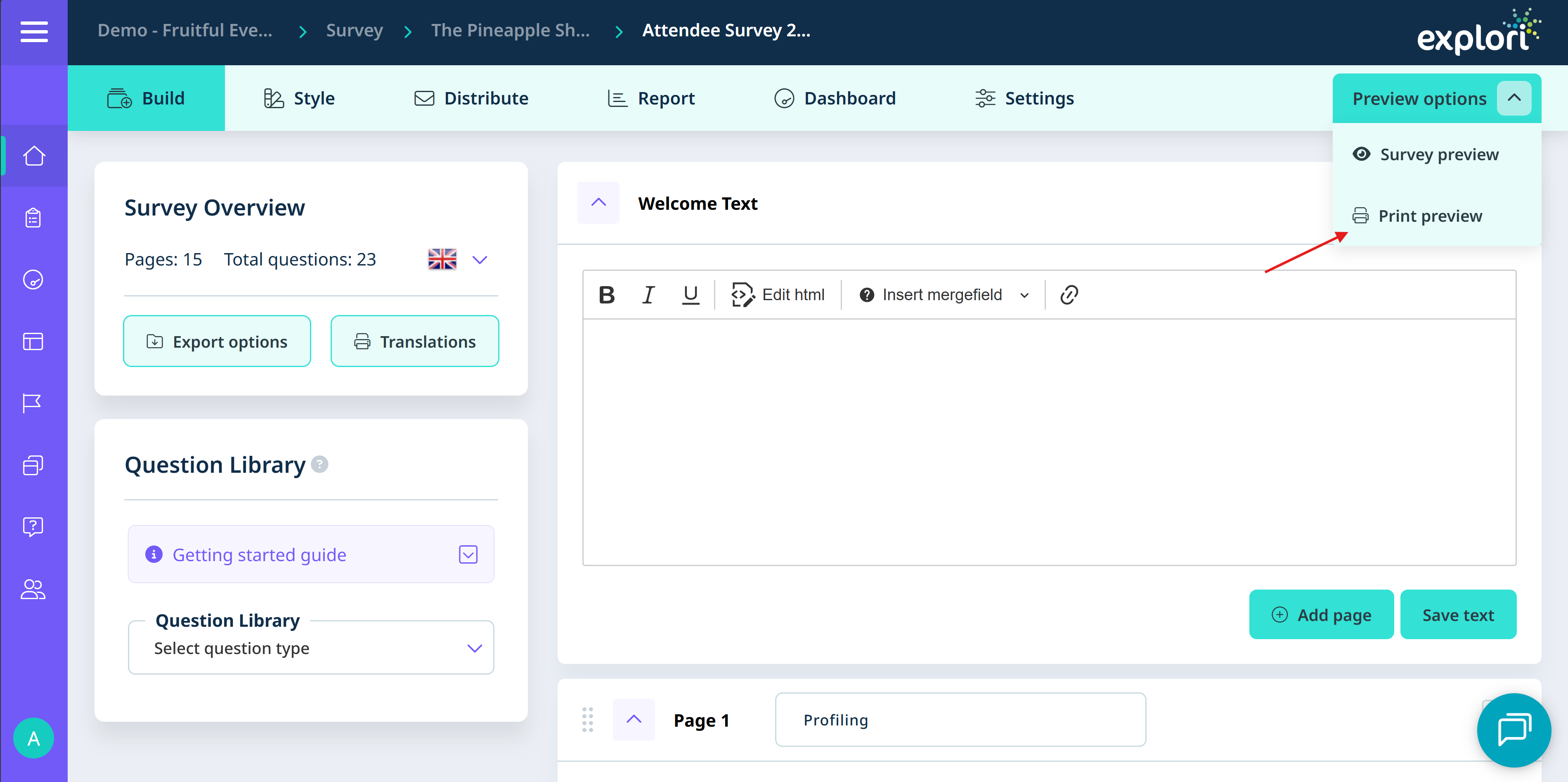 You can also preview the survey by clicking on the print preview button. This will give you visibility of the page names, the questions and the logic used (if any) so that you can have a full overview of the entire survey. This can more time-efficient than going into each question when building the survey. This is also how you can print out a paper copy of your survey.