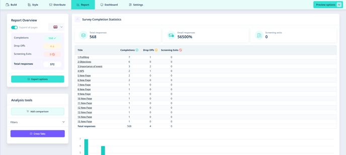 - Drop-offs: This when the respondent leaves the survey with the report showing you the number of exits on each page. If they decided to return and finish it, they will be returned to the last page they completed.