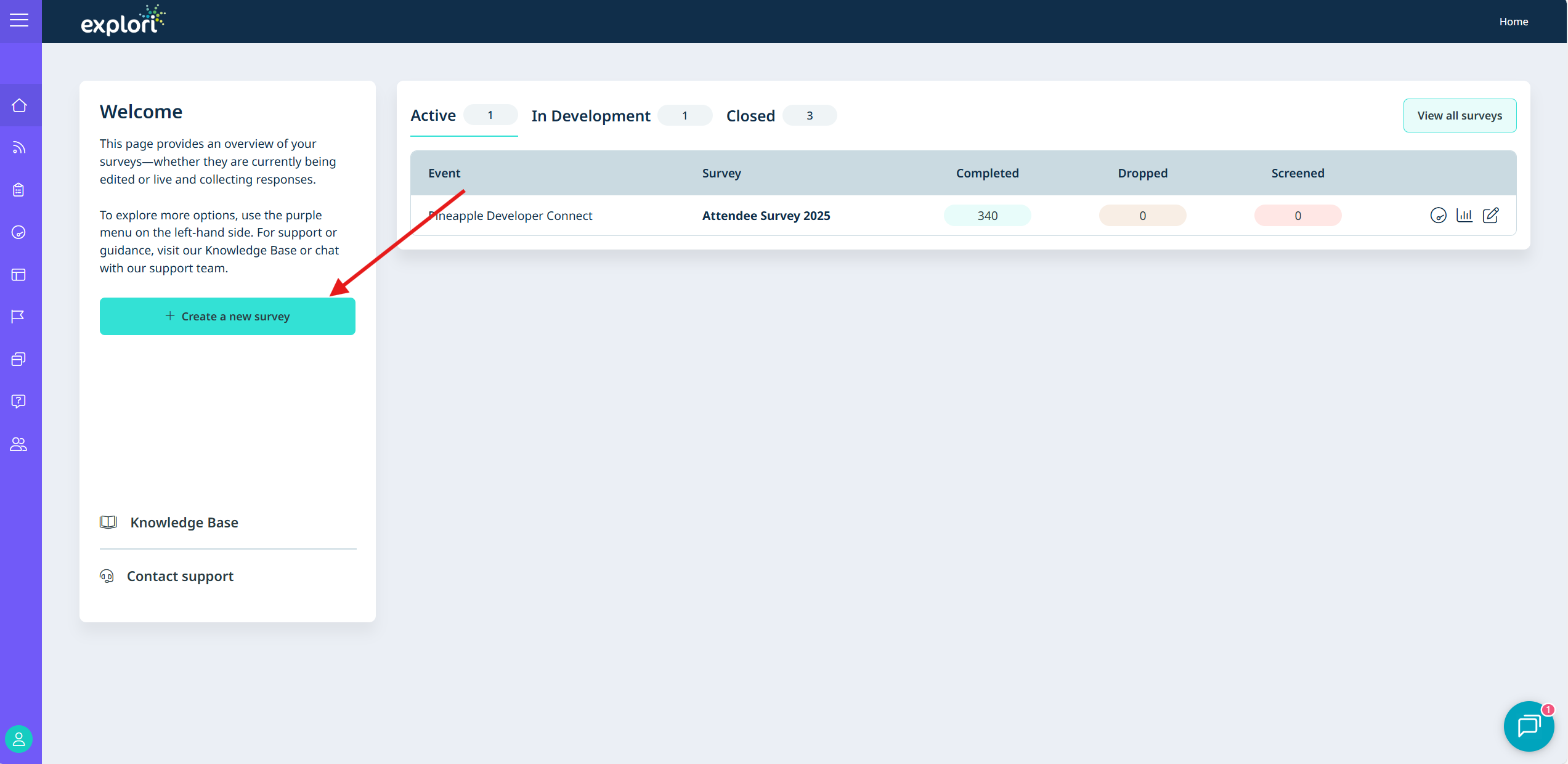 To create a survey, click on the "Create survey" button on the left-hand side of the Explori Home screen:
