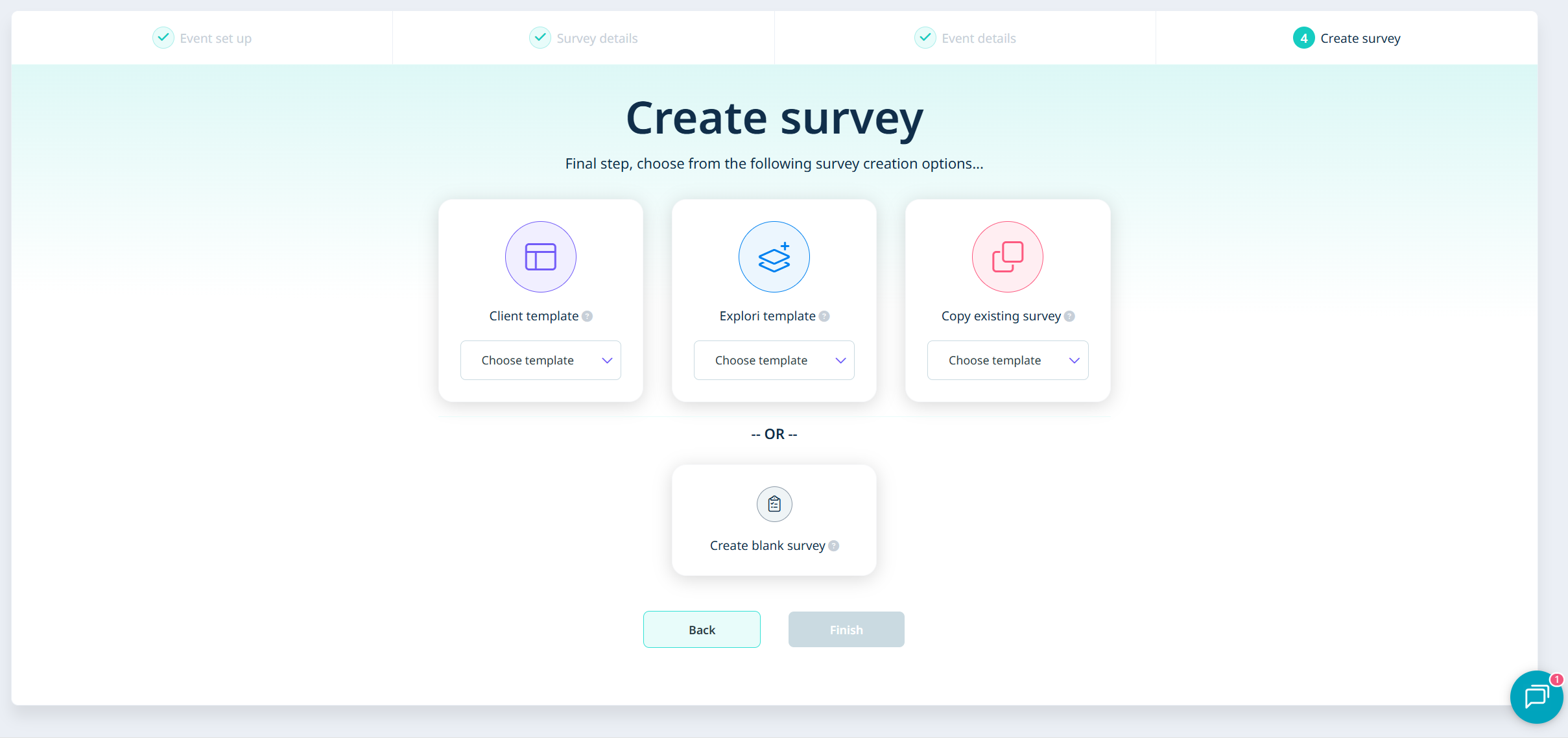 You can use a company template that has been previously set up, copy a previous survey from the same event (or a survey from a different event in the same portfolio if a survey exists), use a company template that has been previously set up, use an Explori template or you can start from scratch if you want to start with a blank survey with no other questions.